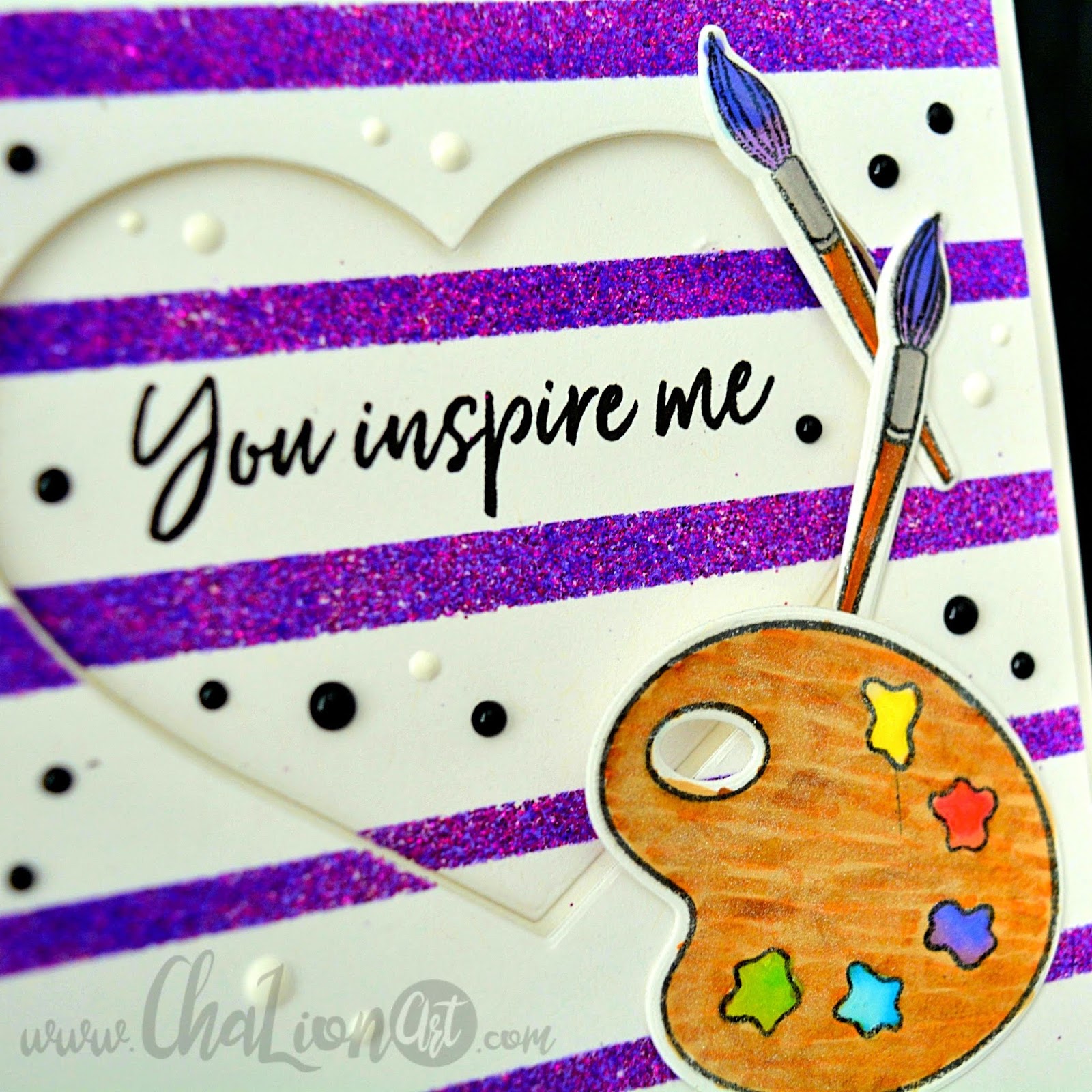 I picked the palette and brush images from the main kit. I stamped both images using the mini MISTI for stamping several times. I stamped the images using Intense Black Ink because I colored these images with alcohol markers, ProMarkers and BrushMarkers. I added some shimmer to the images using the NUVO shimmer pen.