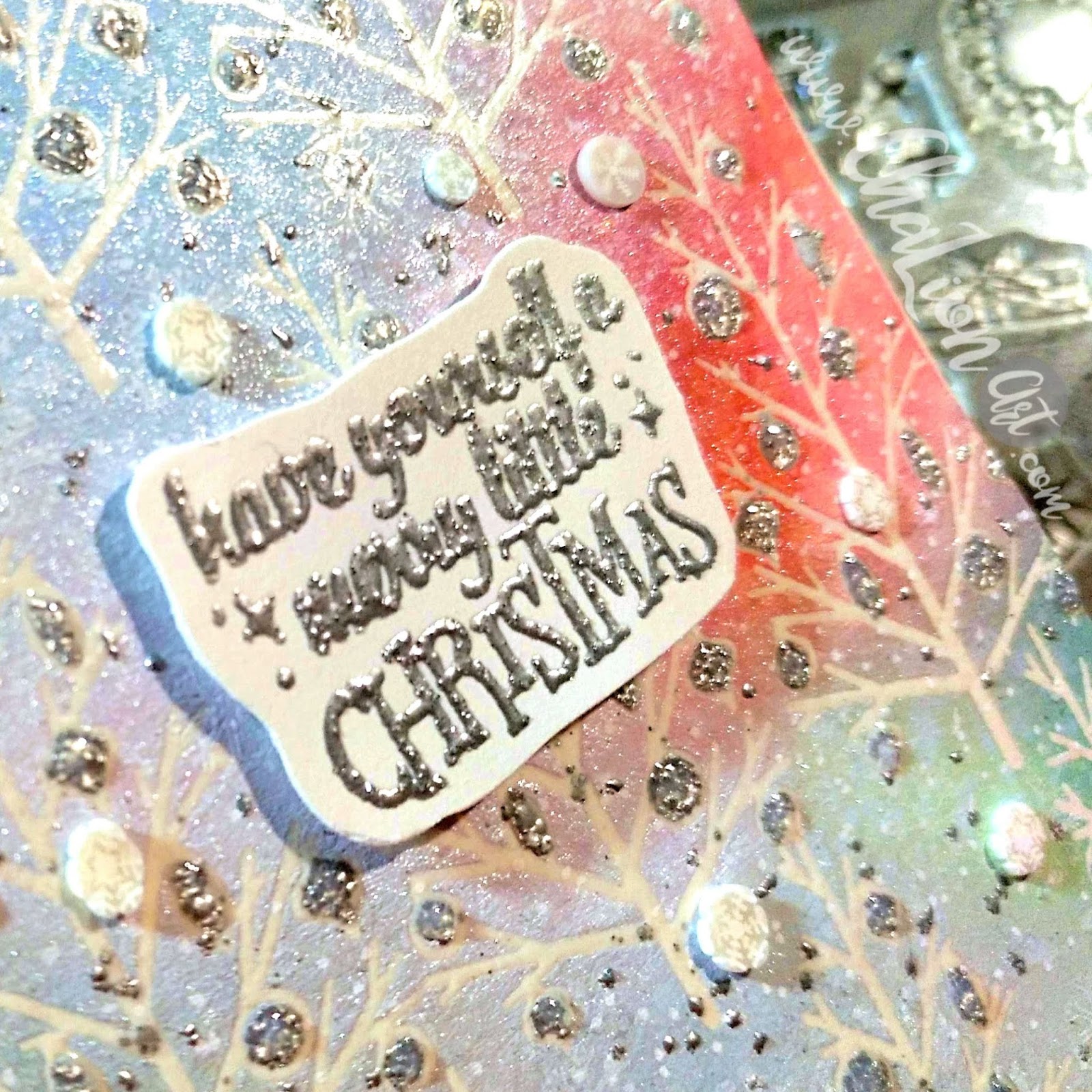 For coloring this panel, I used some Ink Blending Tools for different color inks. I colored the panel with Distress Oxide Inks - Festive Berries, Tumbled Glass, Milled Lavender, Spun Sugar, Cracked Pistachio, Evergreen Bough. When I finished coloring, I used again the anti-static powder tool and decided to use a glue pen to color the tree adornments. What's more, I added some dots on the background with the same pen. Later, I added some Silver Sparkle Embossing Powder and used the heat tool*. I sprayed some Shimmer Mist to the background to give a little shine and dried a little bit with the heat tool. I sprayed a little water too to give a little interest to the background. Besides, I used an acrylic block to add some snowflakes on the background with White Unicorn Pigment Ink.