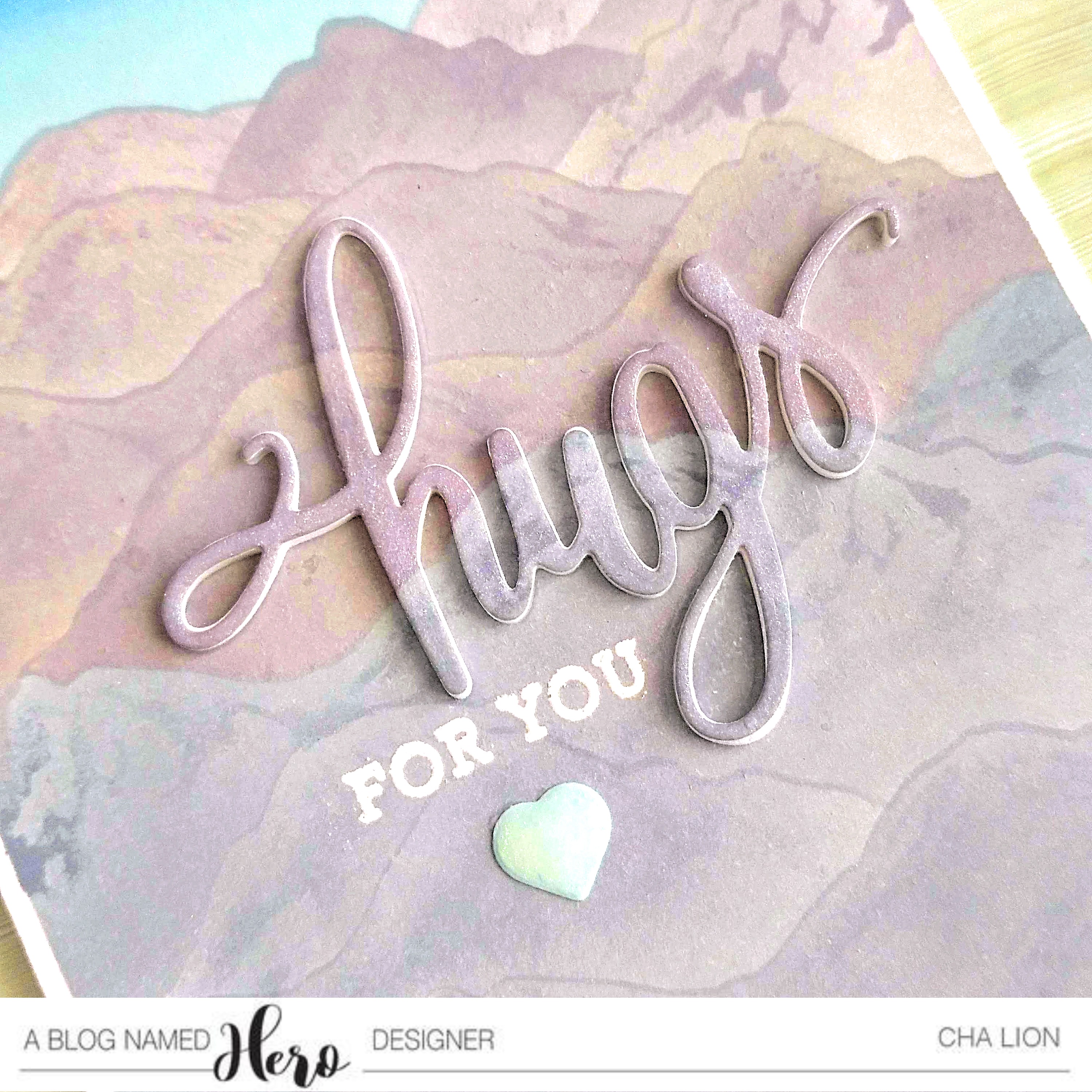 For embellishments, I added a small heart that I die cut from Hero Arts Mist Premium Cardstock and added a little bit of shine on it and also, on the word 'hugs' using the NUVO Aqua Shimmer Pen.